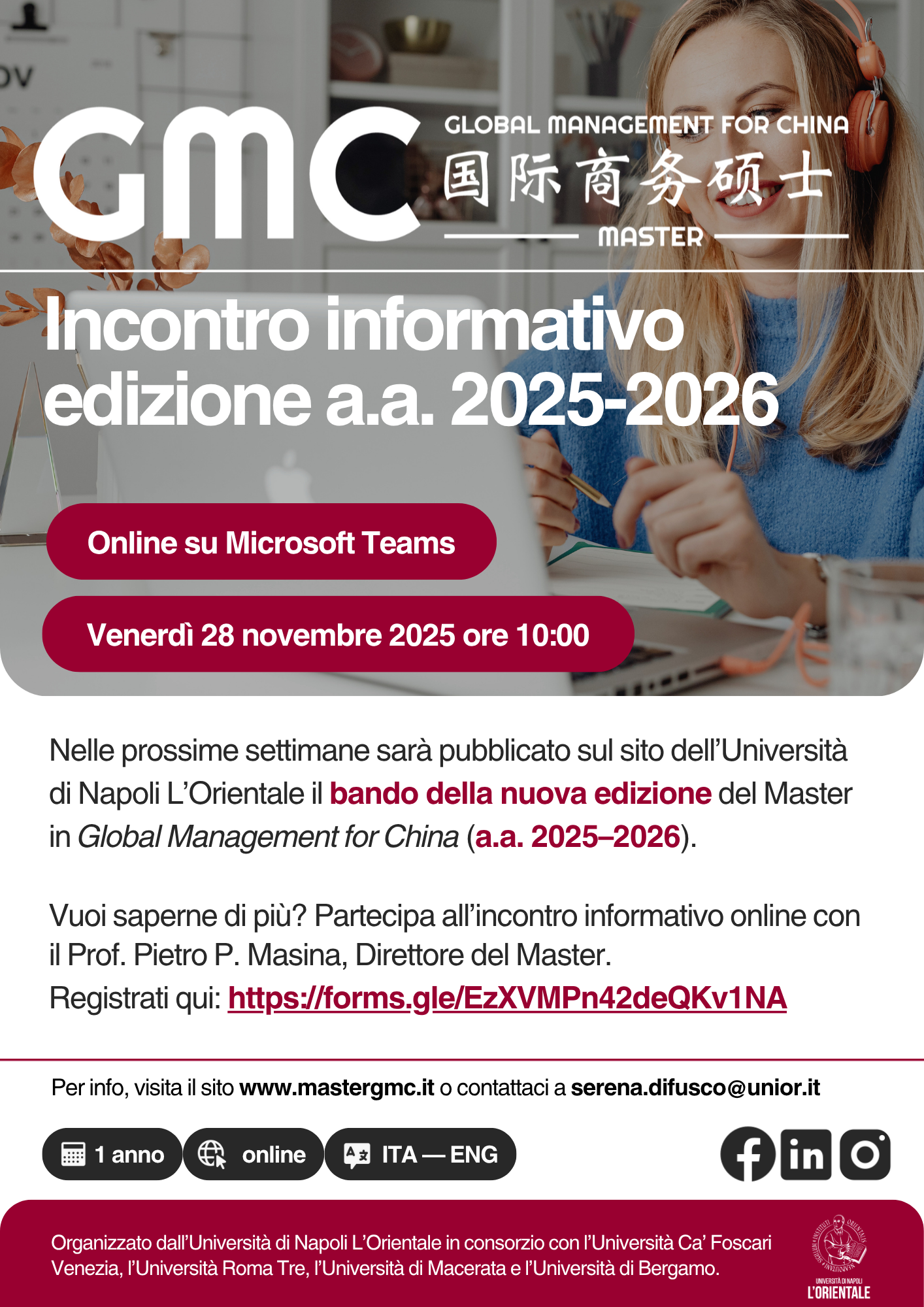 Nelle prossime settimane sarà pubblicato, sul sito dell’Università di Napoli L’Orientale, il bando della nuova edizione del Master in Global Management for China (a.a. 2025–2026): un master di durata annuale, con un percorso formativo di 60 crediti formativi universitari (CFU), pari a 1500 ore di impegno complessivo.